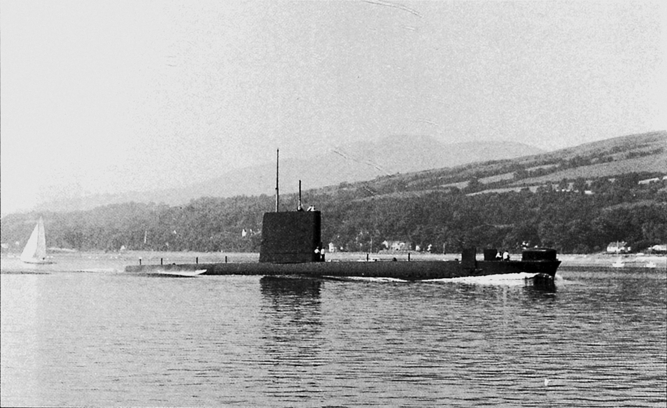 HMS Porpoise на пути вверх по озеру Гаре-Лох к базе подводных лодок в Клайде, 1978