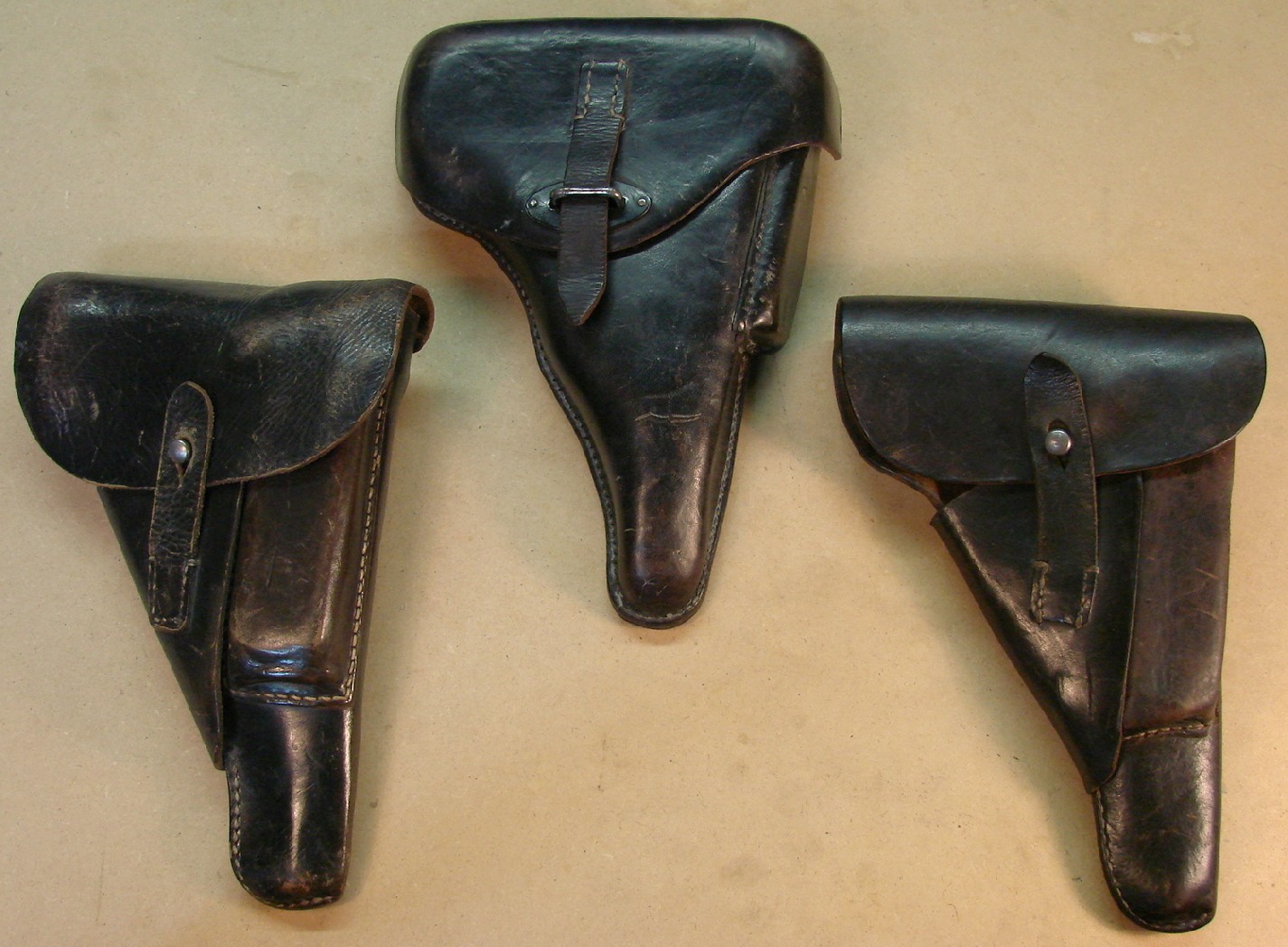 Two 1943 soft shell and one P38 hardshell holster dated 44