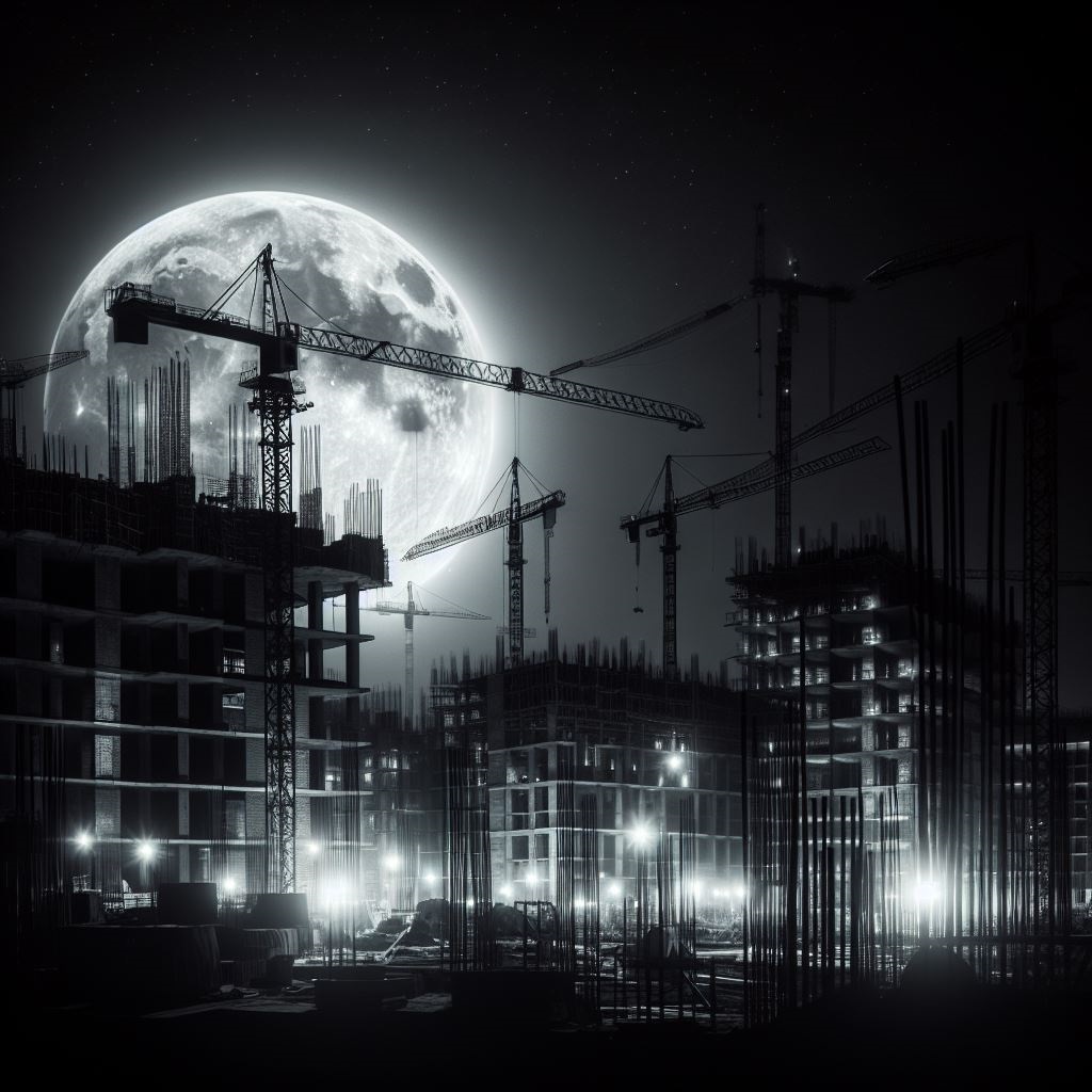 cranes before a gibbous moon construction