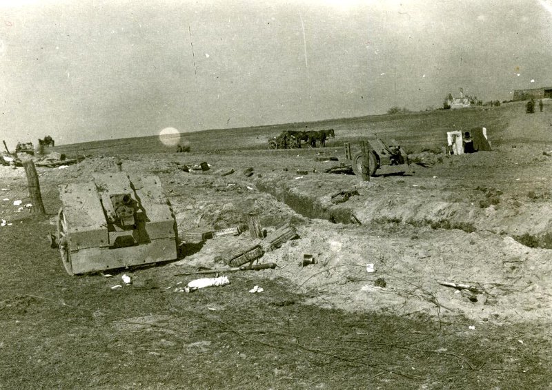 Поле боя. Окоп. Два немецких 75-мм легких пехотных орудия LEJG-18