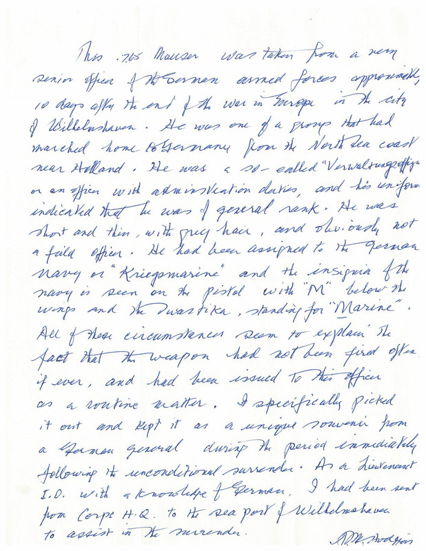 Provenance document dated January 11th 1991 for the Variation 2 Mauser Model 1934 KM marked pistol