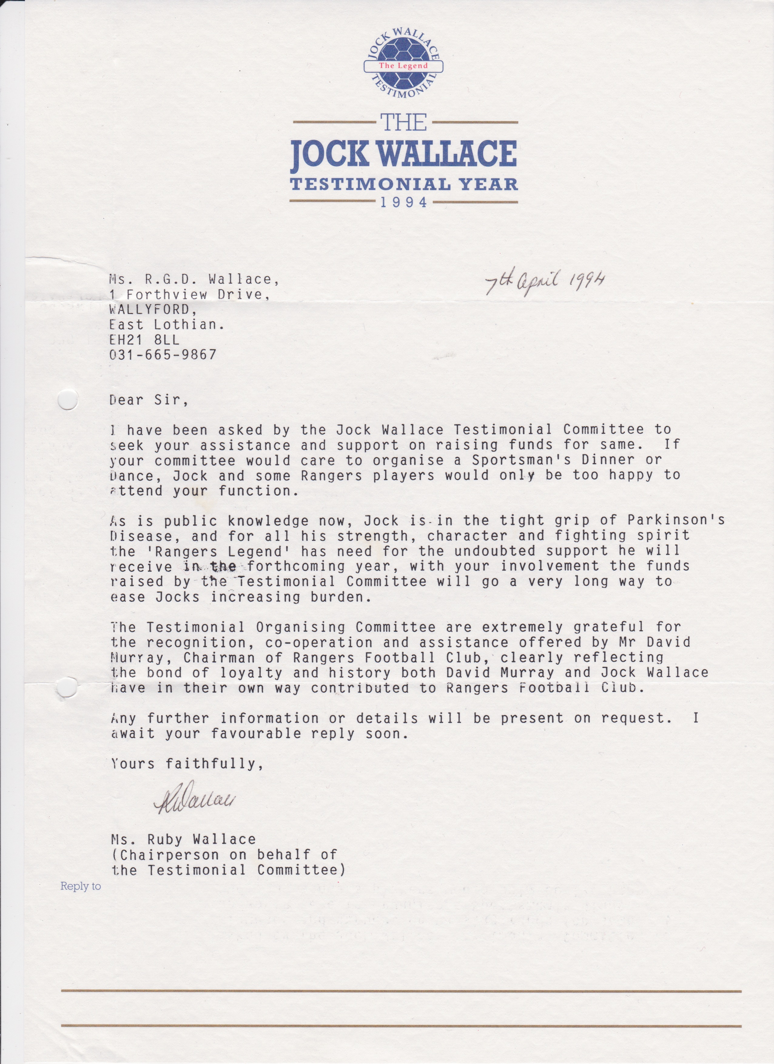 Jock Wallace Testimonial Year letter