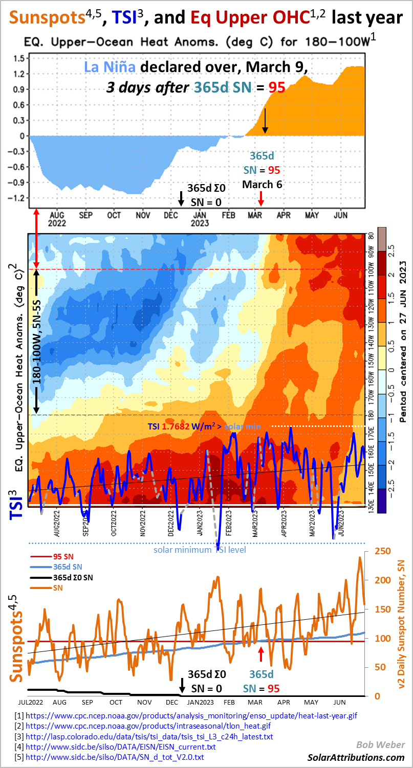 Sunspots, TSI, and Eq OHC last year, 27Jun23