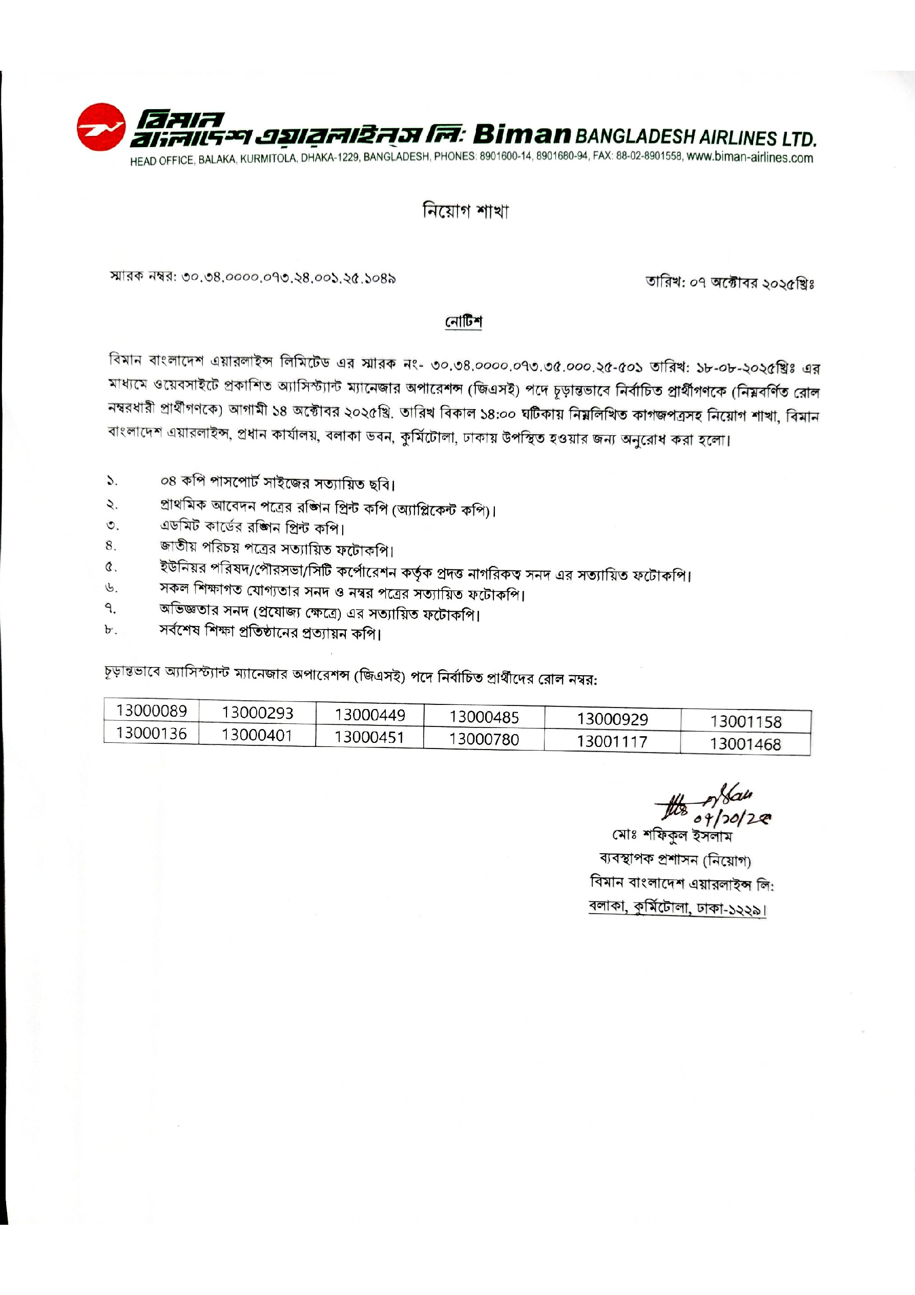 Biman Bangladesh Airlines Assistant Manager Operations (GSE) Joining Date 2025 PDF