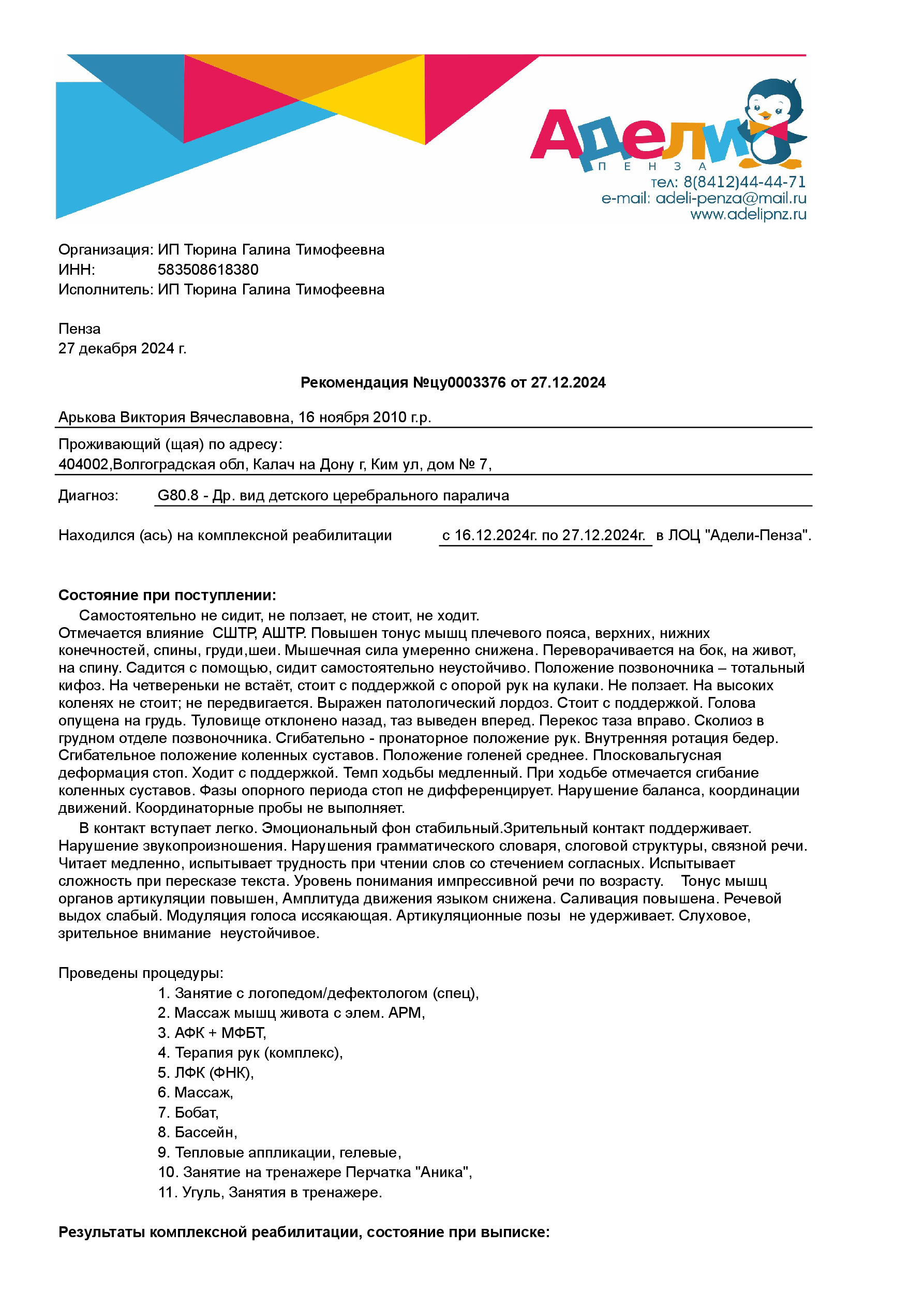 Выписка пациента Арькова Виктория Вячеславовна (16.11.2010) №цу0003376