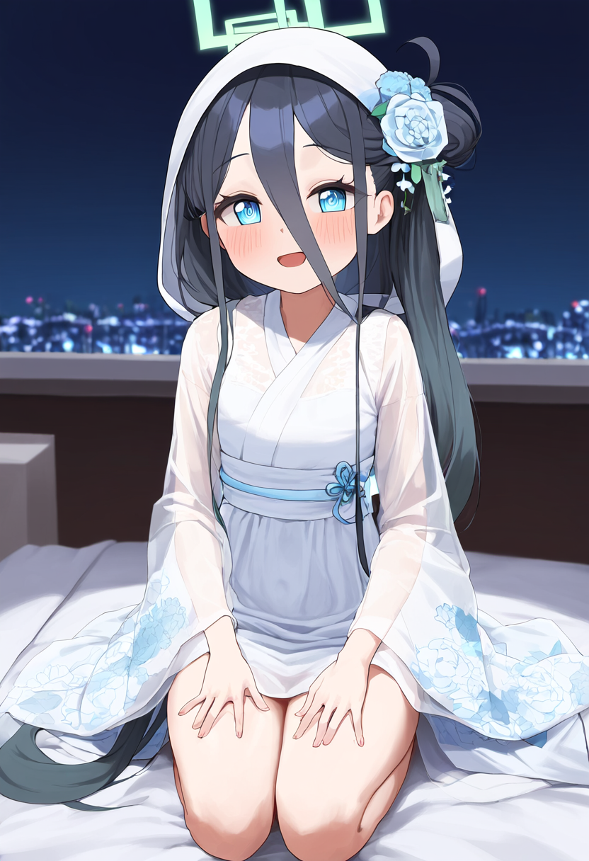 1girl, healthyman, aris (blue archive), blush, happy, hood, blue wedding kimono, s-366205502