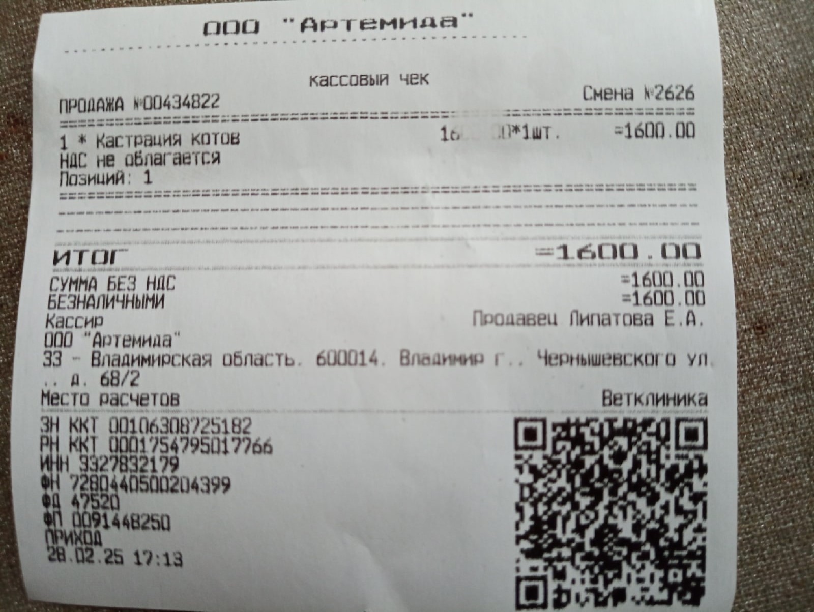 ЧЕК КАСТРАЦИЯ 1600