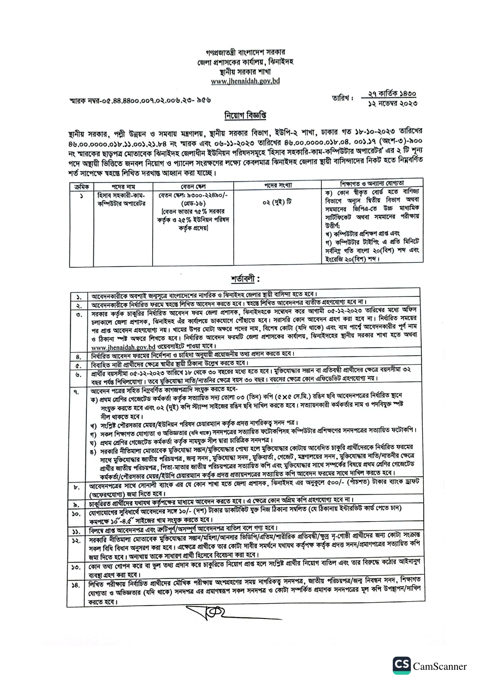 DC Office Jhenaidah Job Circular 2023 PDF