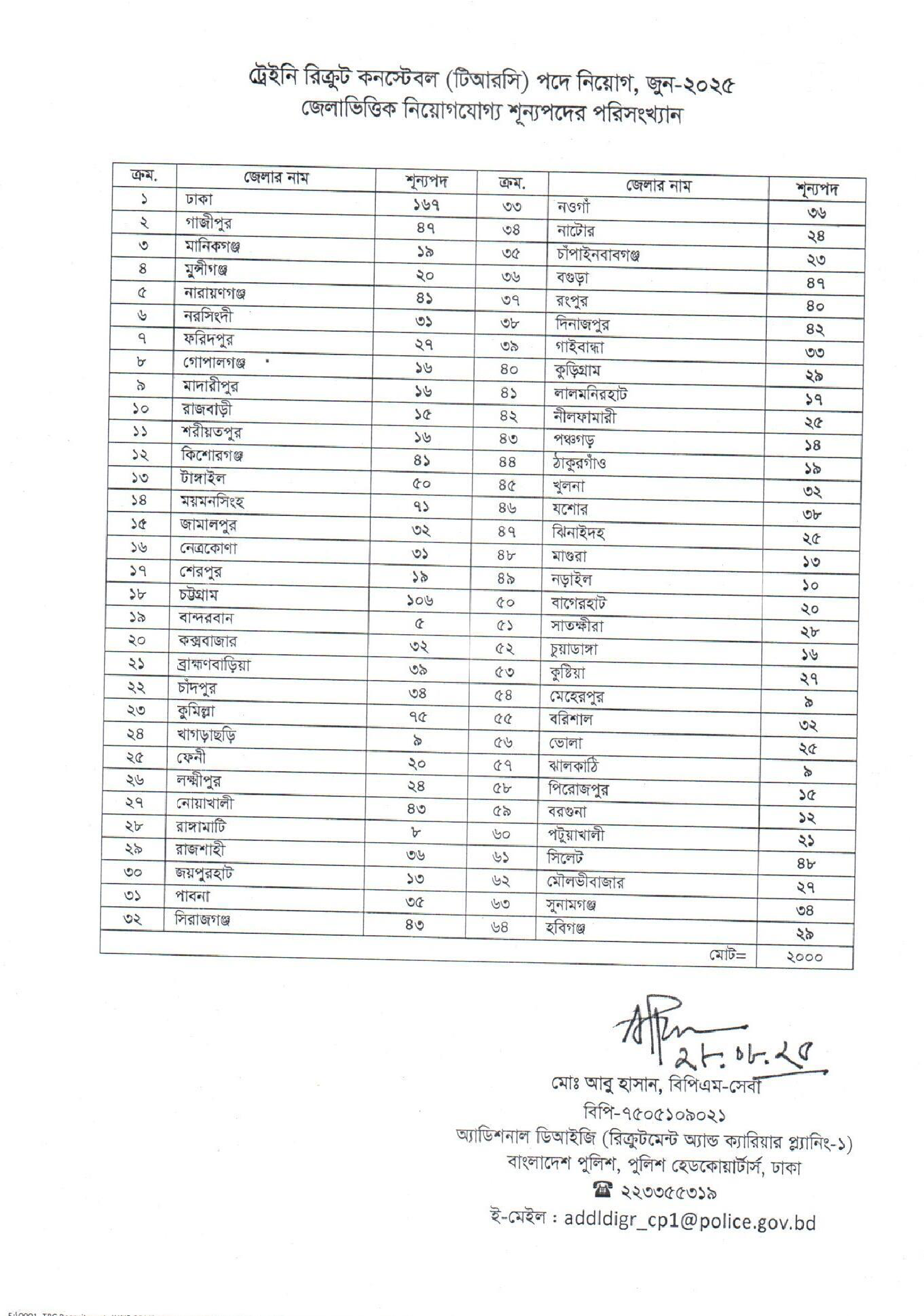 Police Constable District Wise Vacancy List PDF