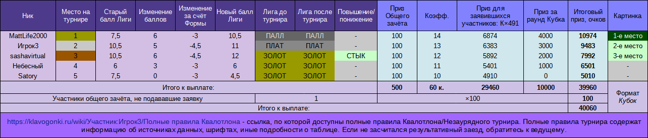 Тестовый турнир №1, положение в лигах