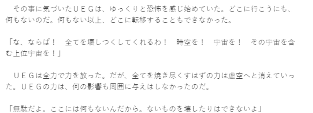 UEG unleashed all of her power with all of her might, but the power that was supposed to destroy everything disappeared into the void. The power of UEG had no effect on the surroundings.