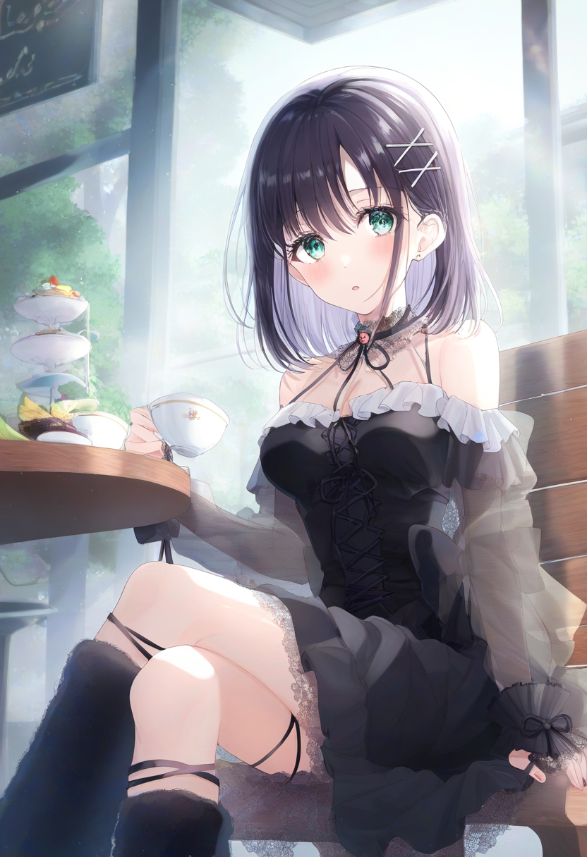 1girl, {{touyoko momoko (saki)}}, black hair, green eyes, leg warmers, leg ribbo s-1137576500