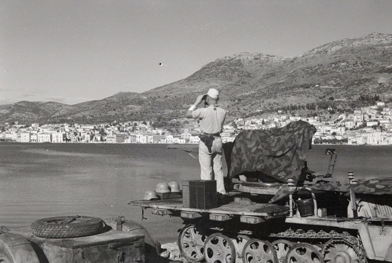 Dans la baie de Vathy, sur l'île de Samos, un artilleur de la FlaK juché sur un semi-chenillé Sd.kfz