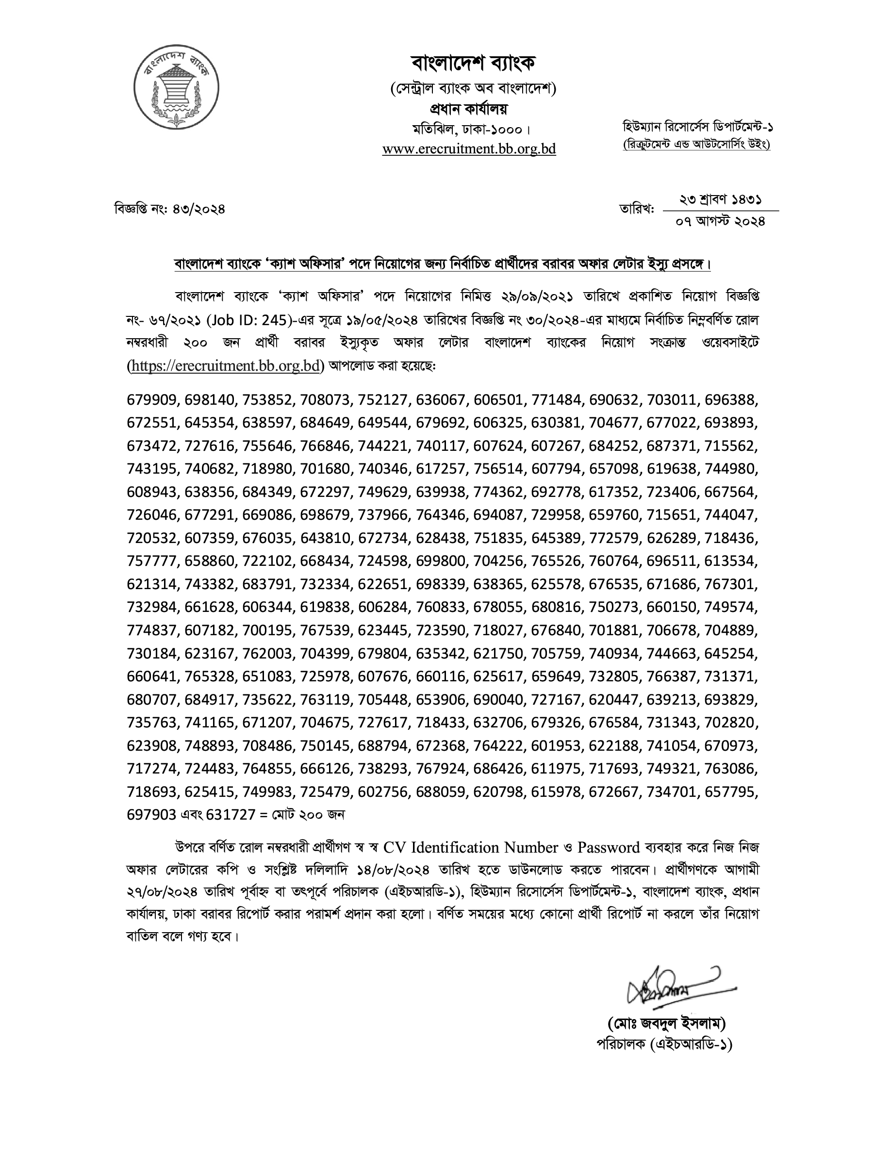 Bangladesh Bank Officer (Cash) Offer Letter Download and Reporting Notice 2024 PDF