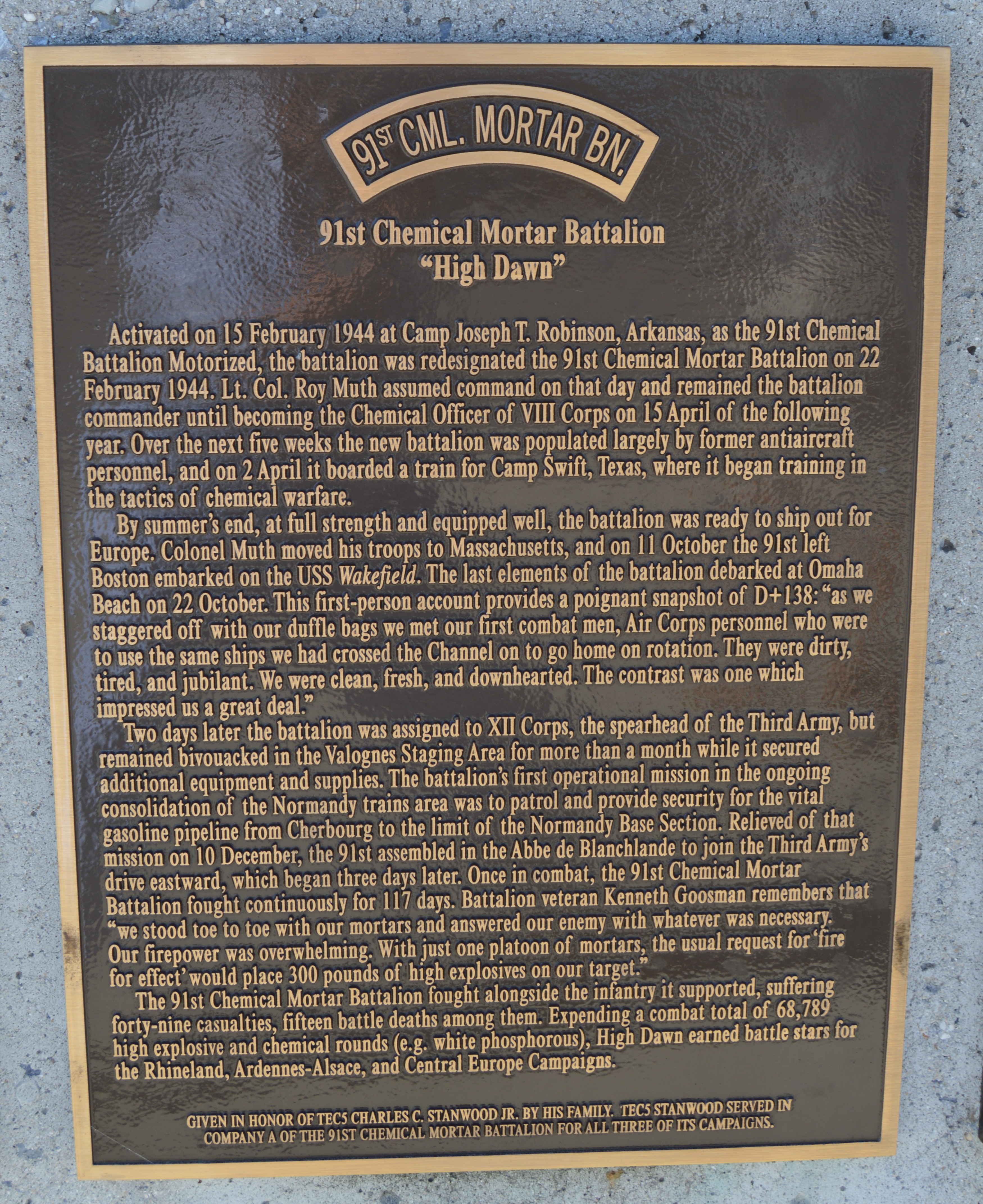 Placa 91º CML. Mortar Bn. en el National D-Day Memorial. Bedford, Virginia