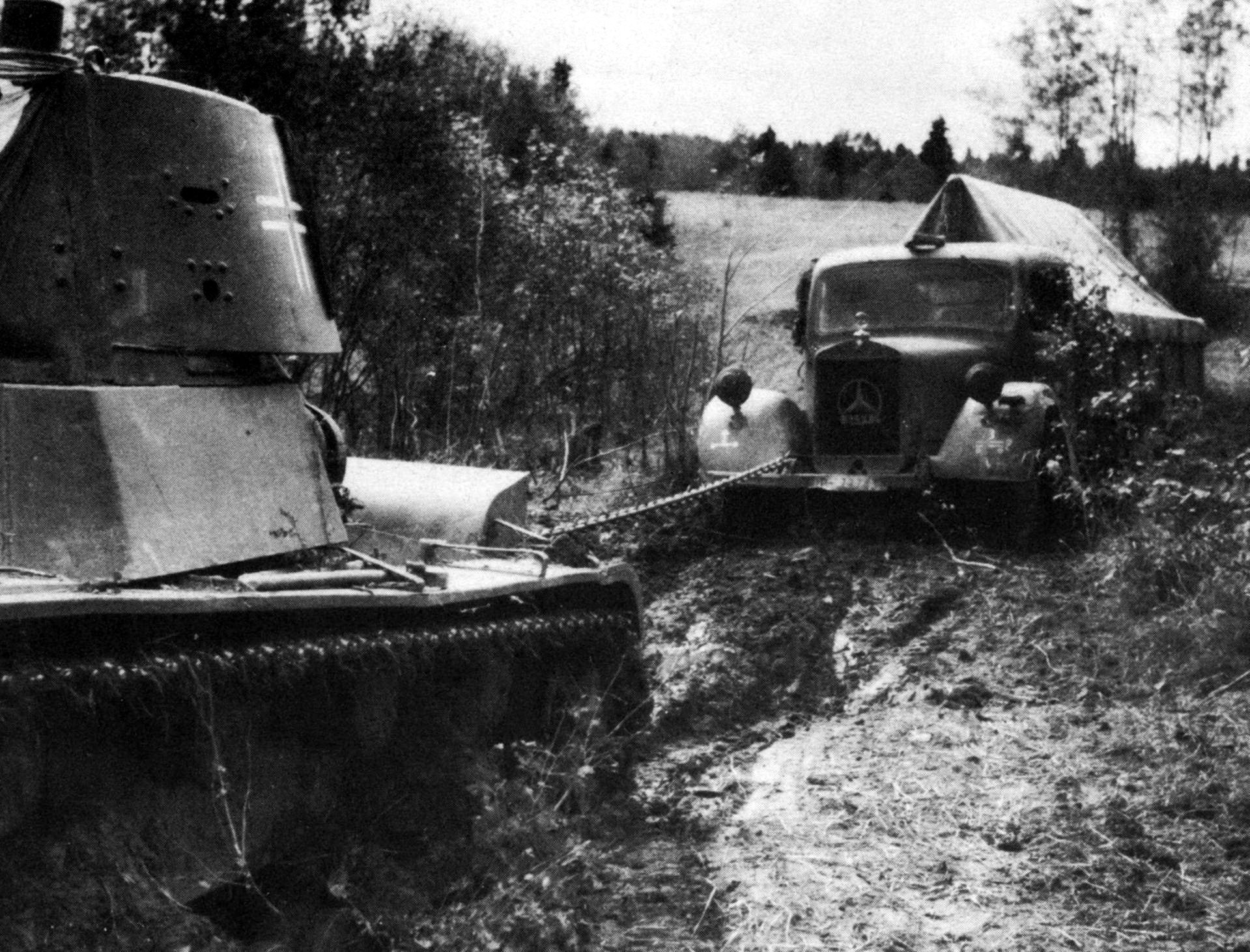 Трофейный советский танк Т-26 вытаскивает из грязи немецкий грузовик Mercedes-Benz L 3000.
