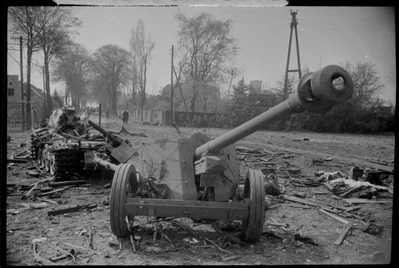 1-й Белорусский фронт. Немецкая 88-мм противотанковая пушка и разбитый пушечный тягач.