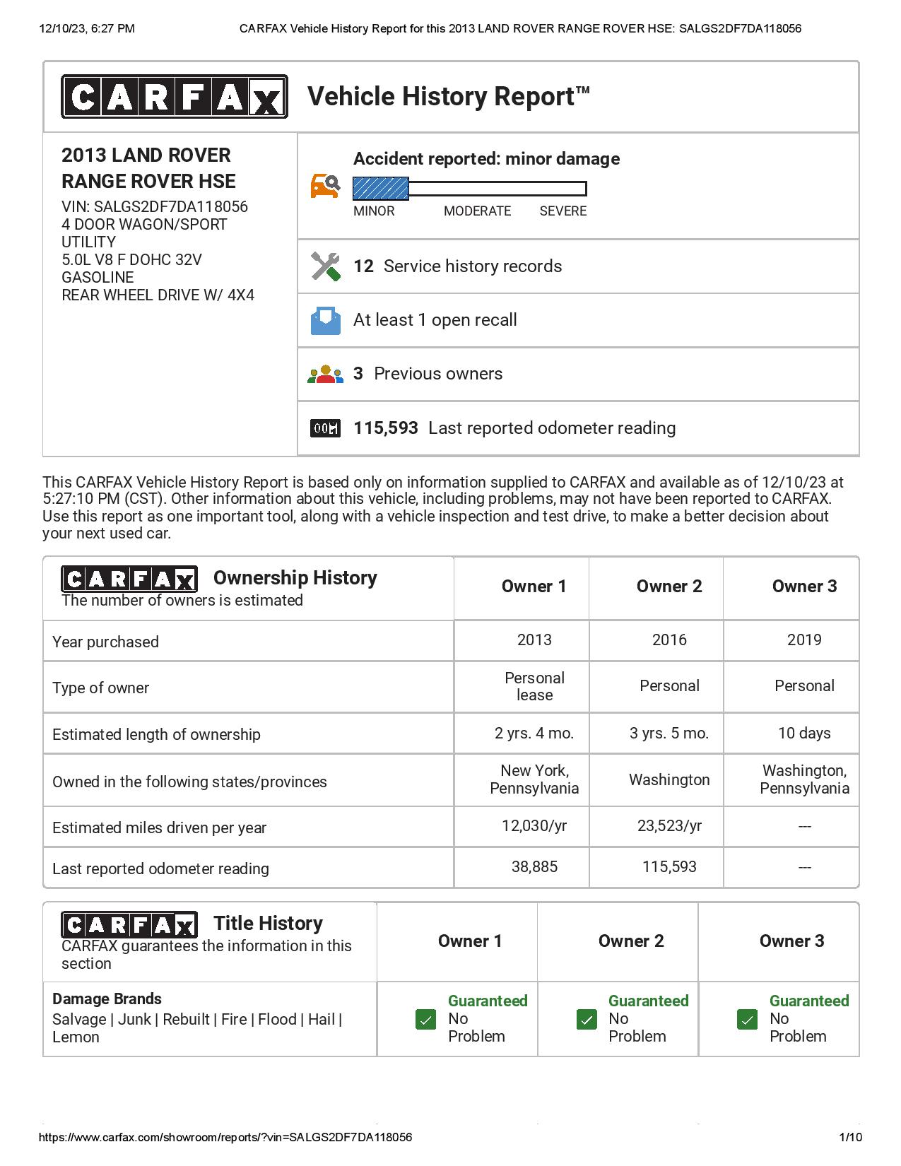 CARFAX Vehicle History Report for this 2013 LAND ROVER RANGE ROVER HSE_ SALGS2DF7DA118056-page-001