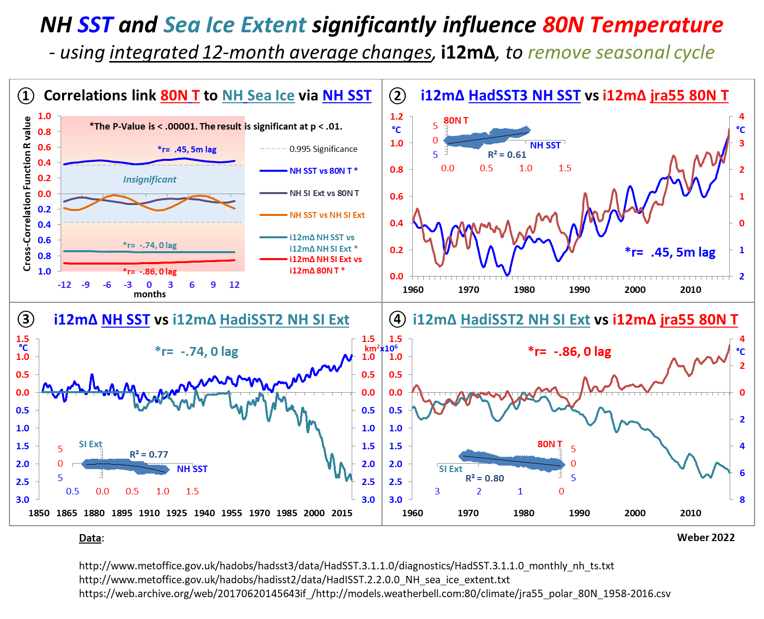 NH SST, NH Sea Ice Extent, and 80N Temperature Correlations
