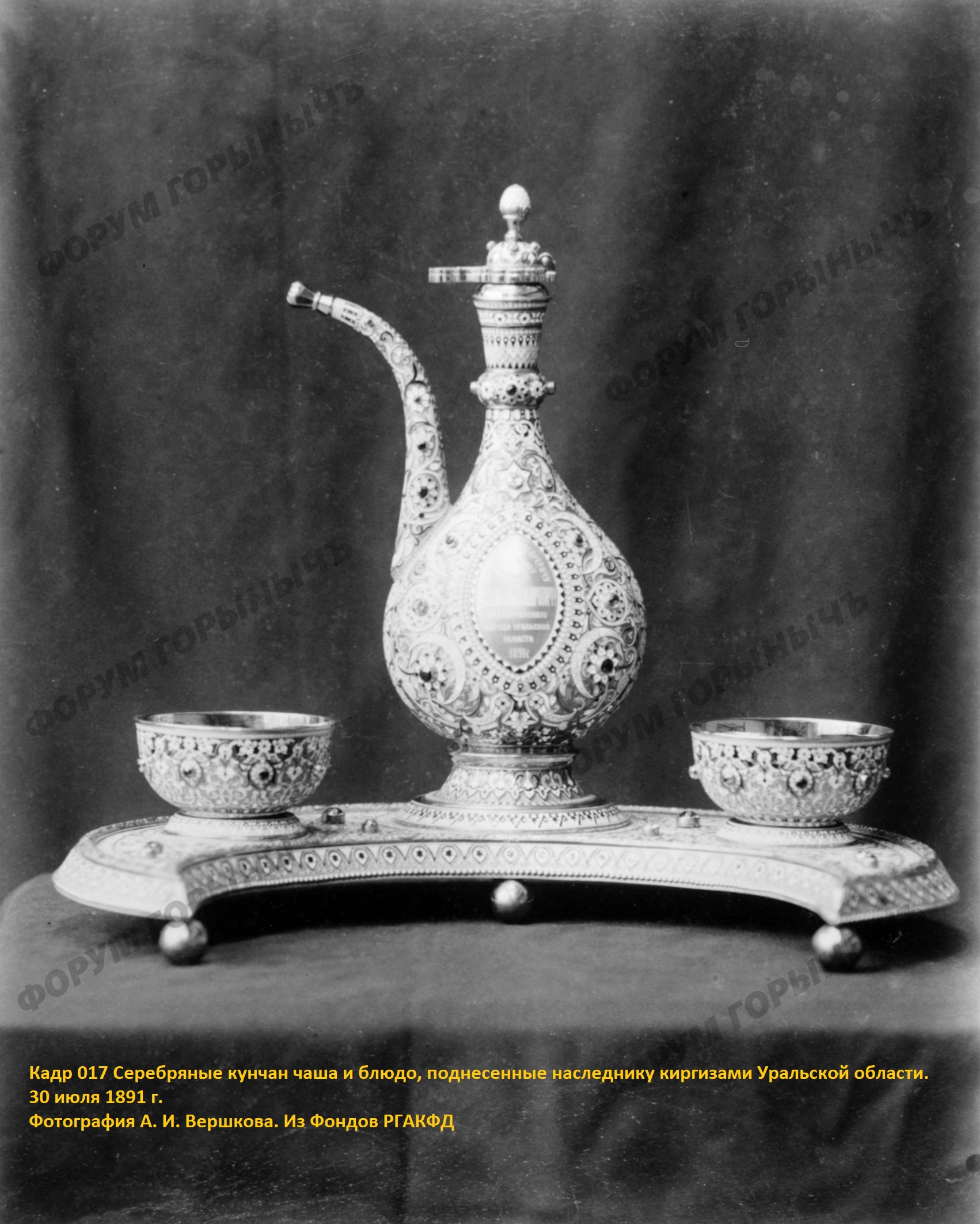 Кадр 17– Серебреные кунчан чаша и блюдо, поднесенные наследнику киргизами Уральской области. 30 июля