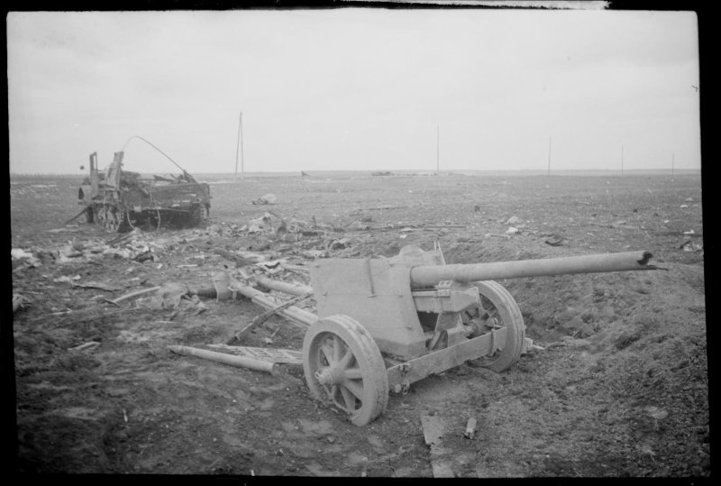1-й Белорусский фронт. Разбитая немецкая полевая 88-мм противотанковая пушка, на втором плане гусени