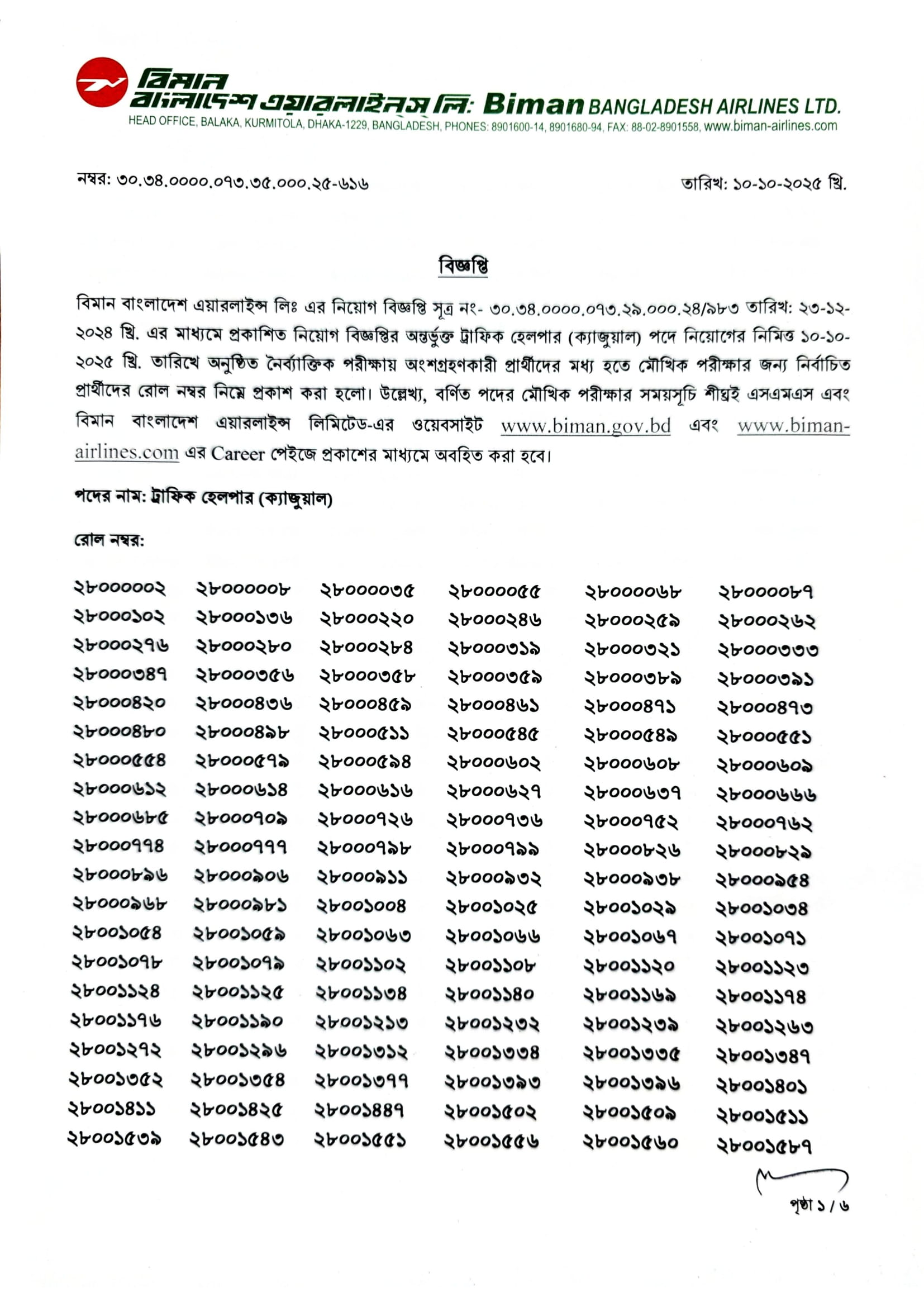 Biman Bangladesh Airlines Traffic Helper (Casual) Exam Result 2025 PDF-1
