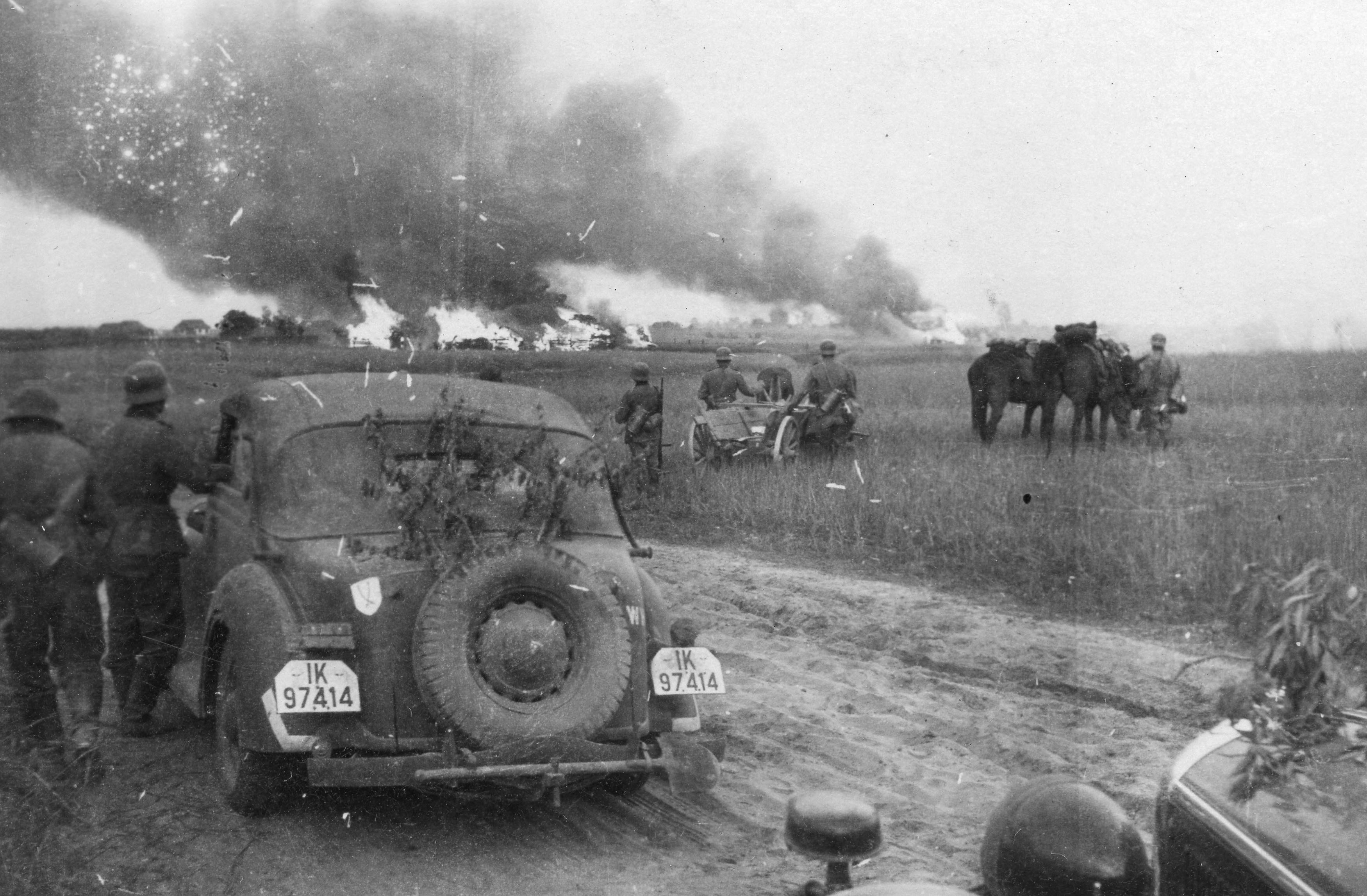 Немецкие солдаты наблюдают за горящей советской деревней