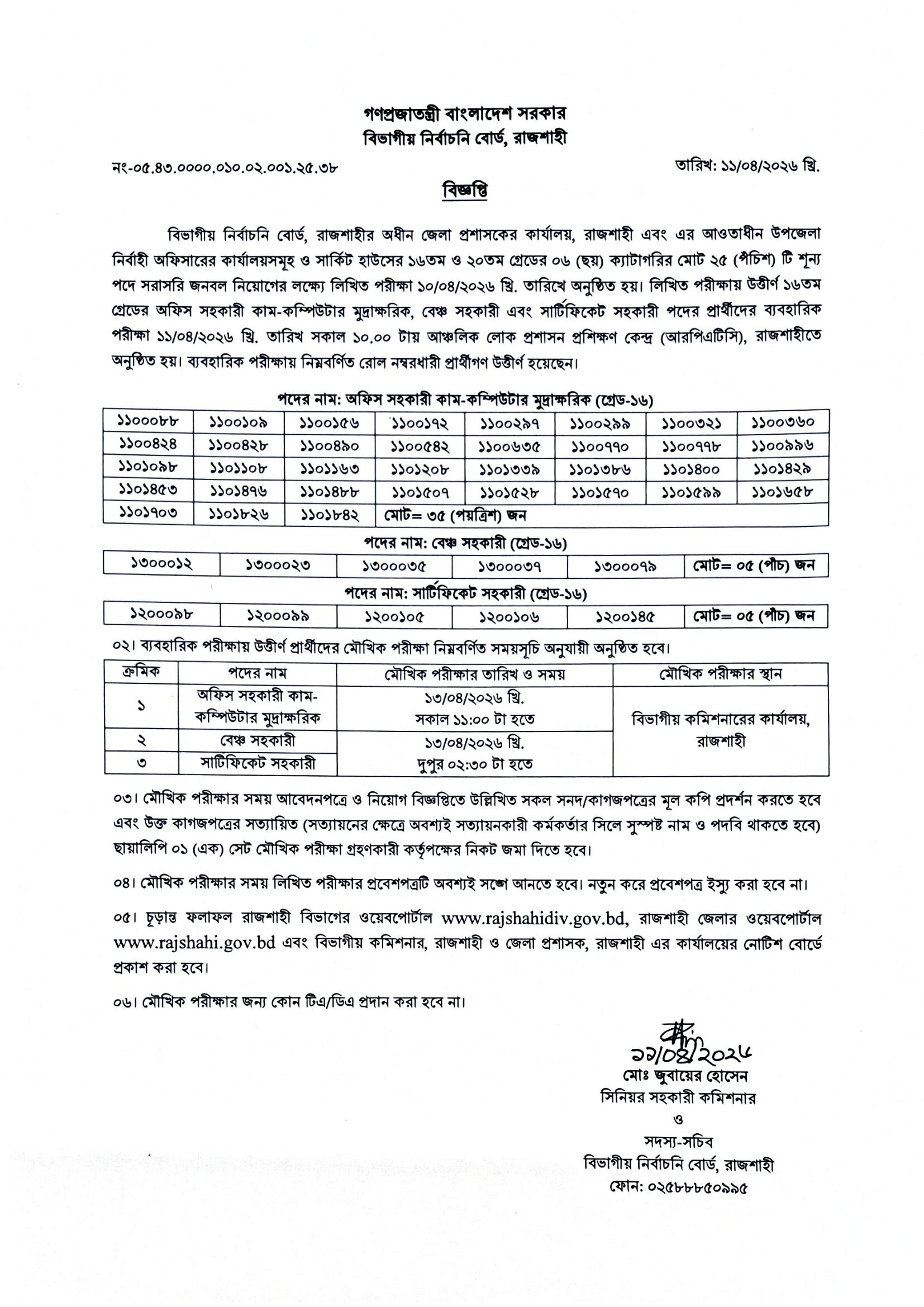 DC Office Rajshahi Practical Result 2026 PDF 1