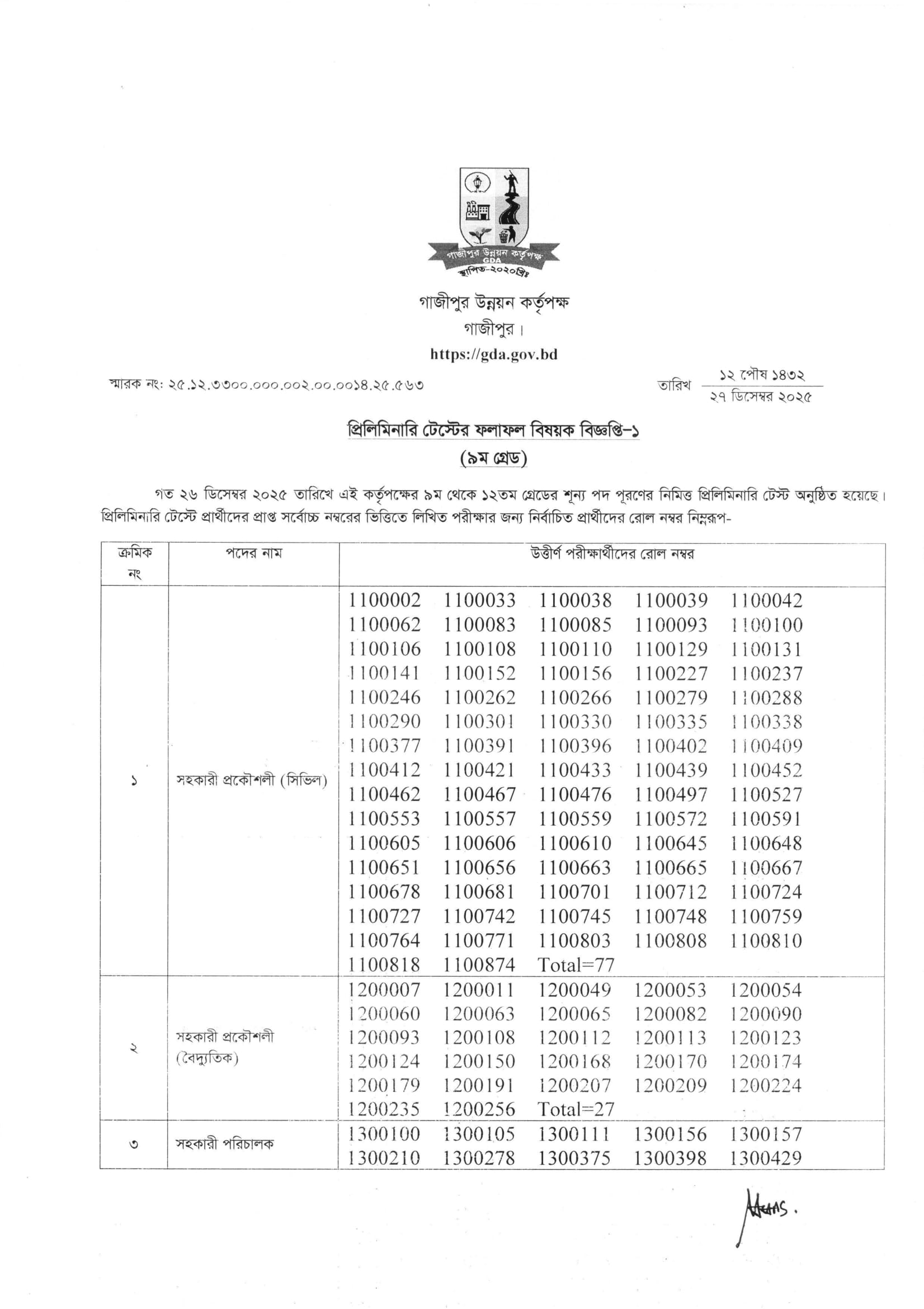 Gazipur Development Authority (GDA) Exam Result 2025 PDF 1