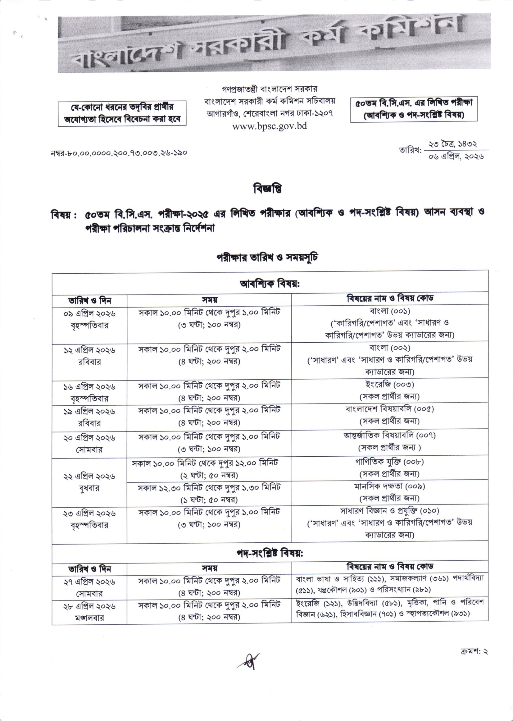 50th BCS Written Exam Seat Plan 2026 PDF 1