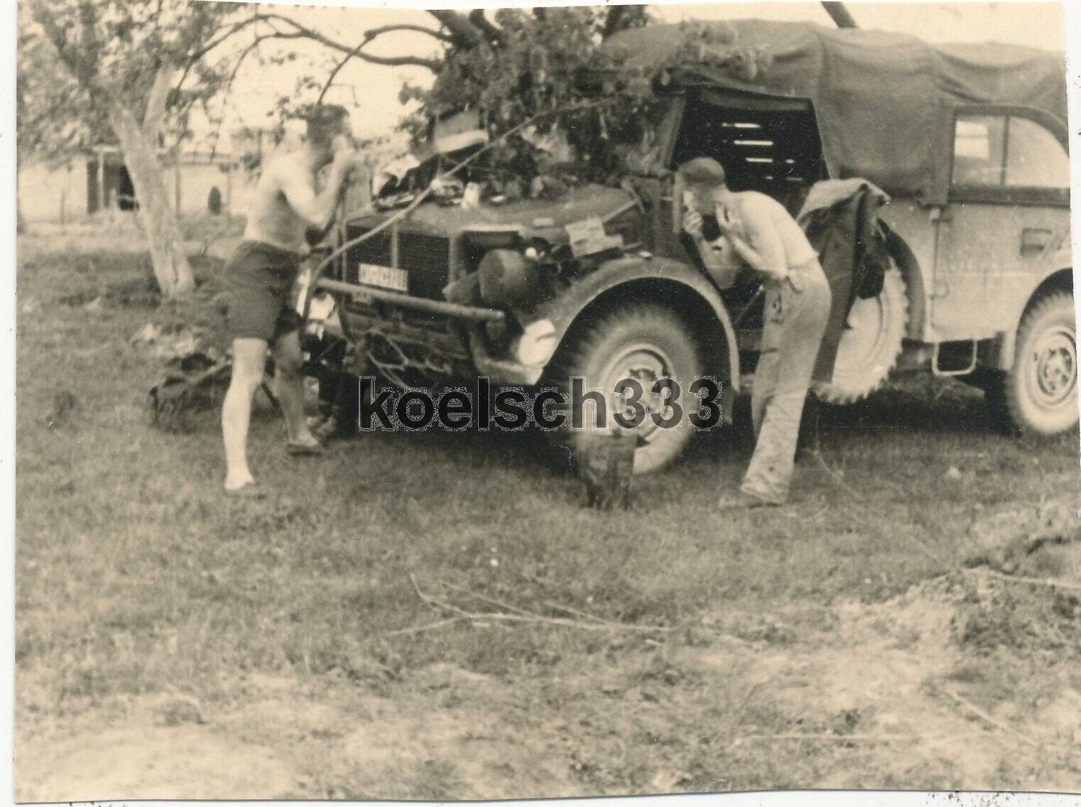 Foto Soldaten bei der Körperpflege am schweren Einheits PKW in Russland