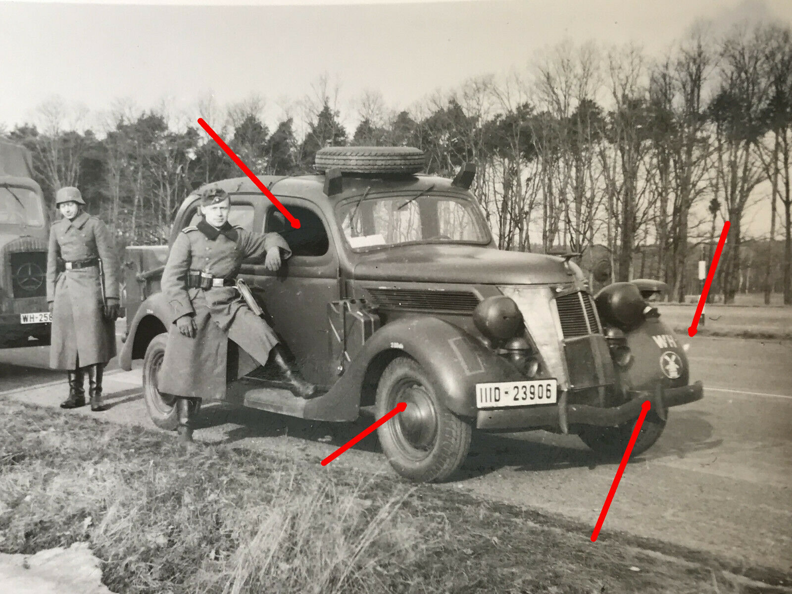 Foto, Auto der 347. Inf. Div. Staffelwappen Windmühle, Limousine, Mercedes LKW