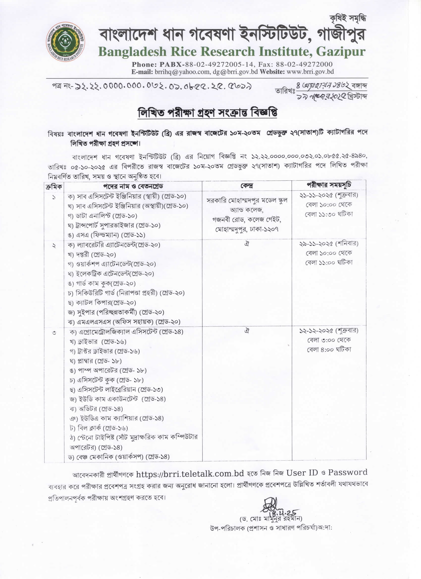 BRRI Exam Date 2025 PDF 1