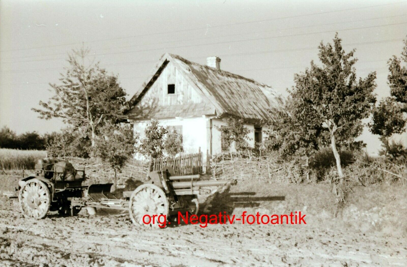 Foto 2 WK Negativ Ostfront Geschütz Haubitze Ausrüstung Wagen vor Bauernhaus