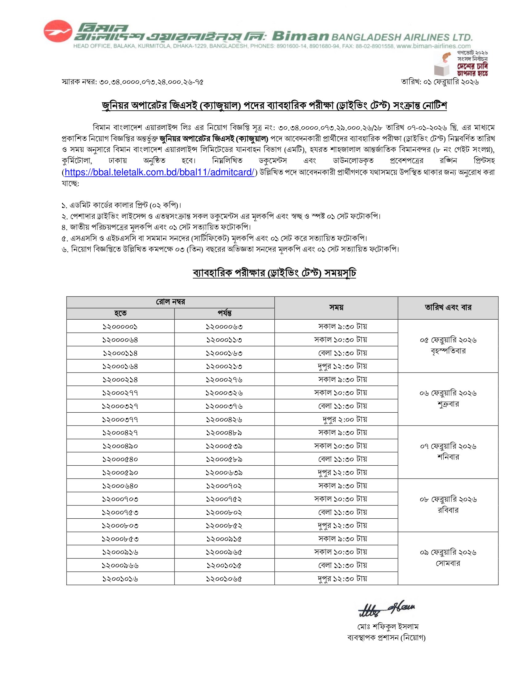 Biman Bangladesh Airlines Junior Operator GSE (Casual) Practical Test Date 2026 PDF 1