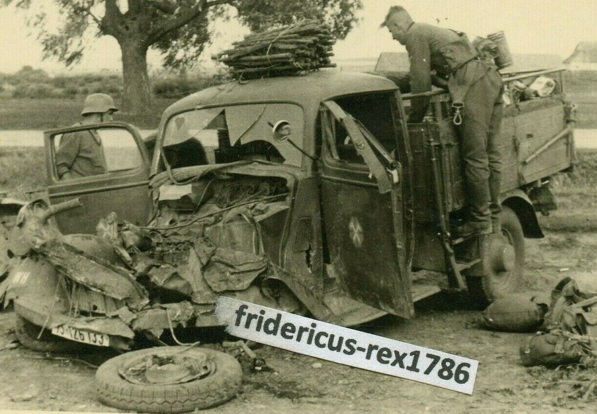 Foto WH Ostfront HKL deut. LKW mit Wappen wird nach Volltreffer geplündert