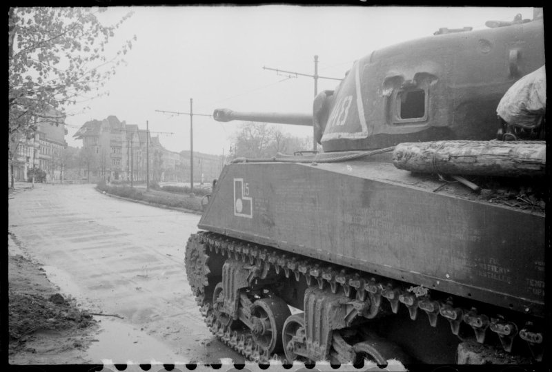 1-й Белорусский фронт. Берлин. Американский танк Шерман в бортовой проекции (№ 148) на улице города.