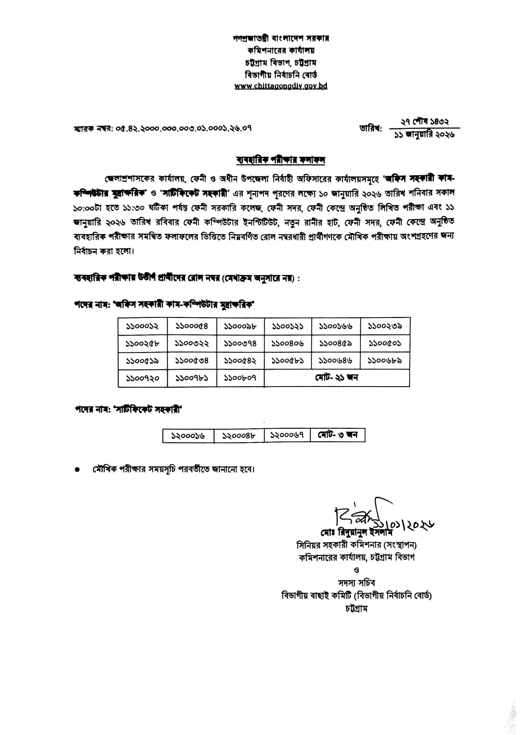 DC Office Feni Practical Test Result 2026 PDF 1