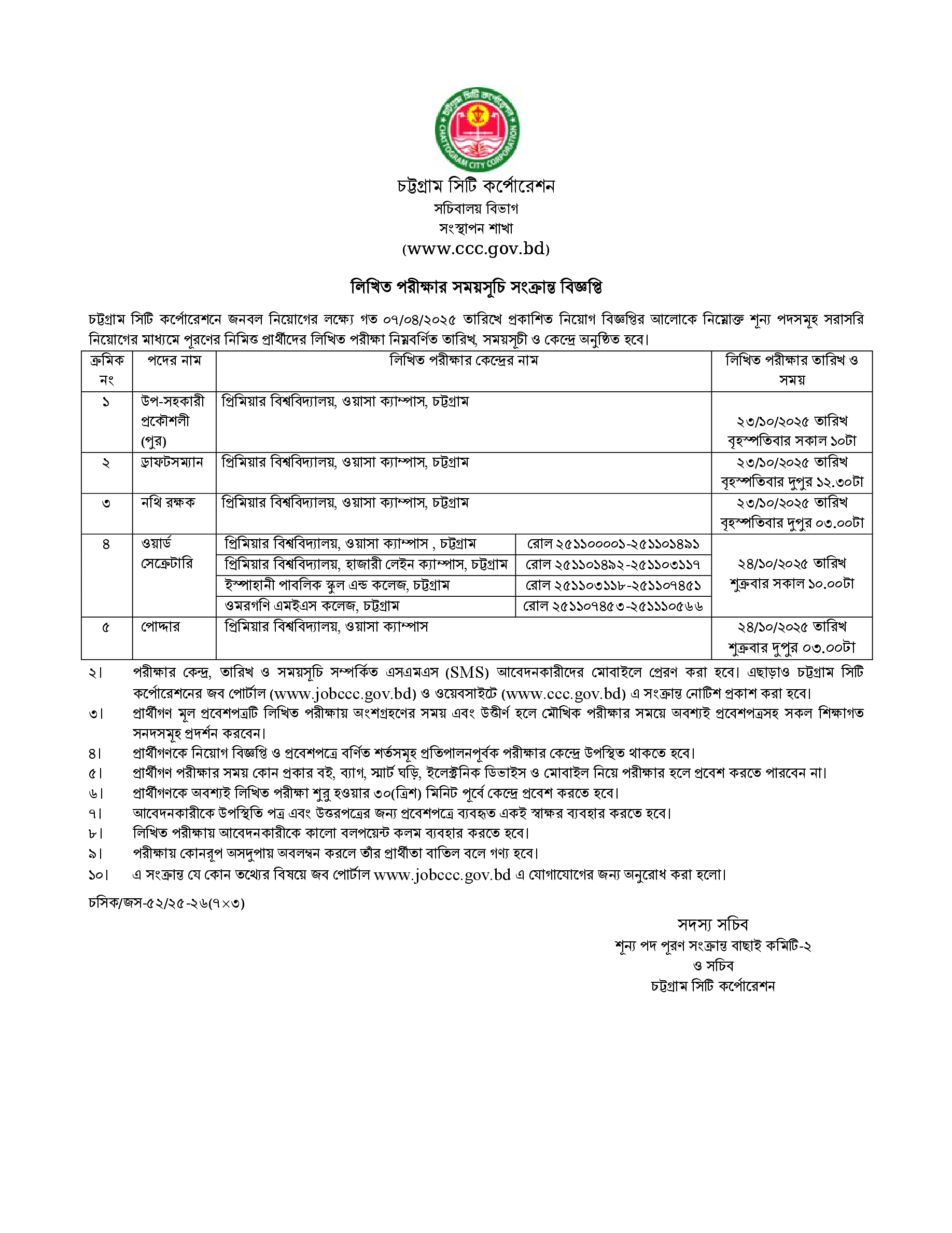 Chattogram City Corporation Exam Date PDF