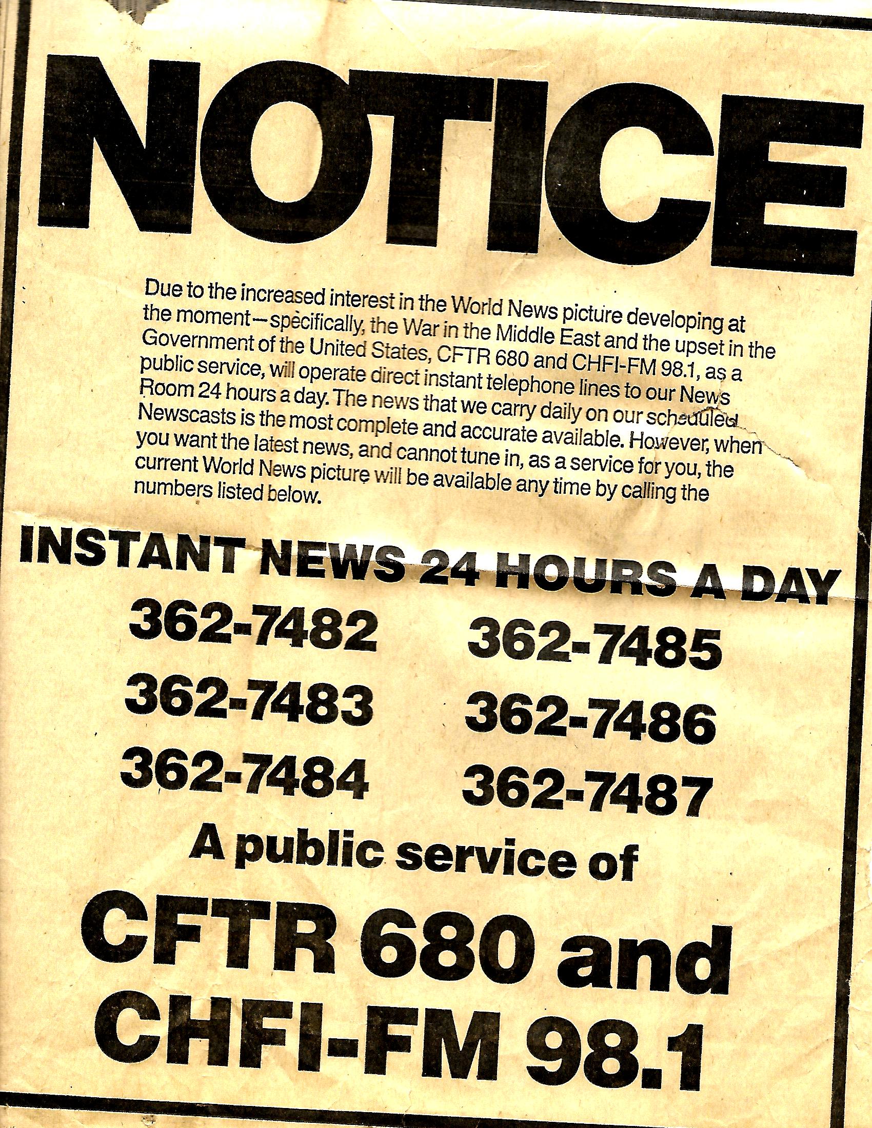 CFTR Phone In News Ad Early 1970s