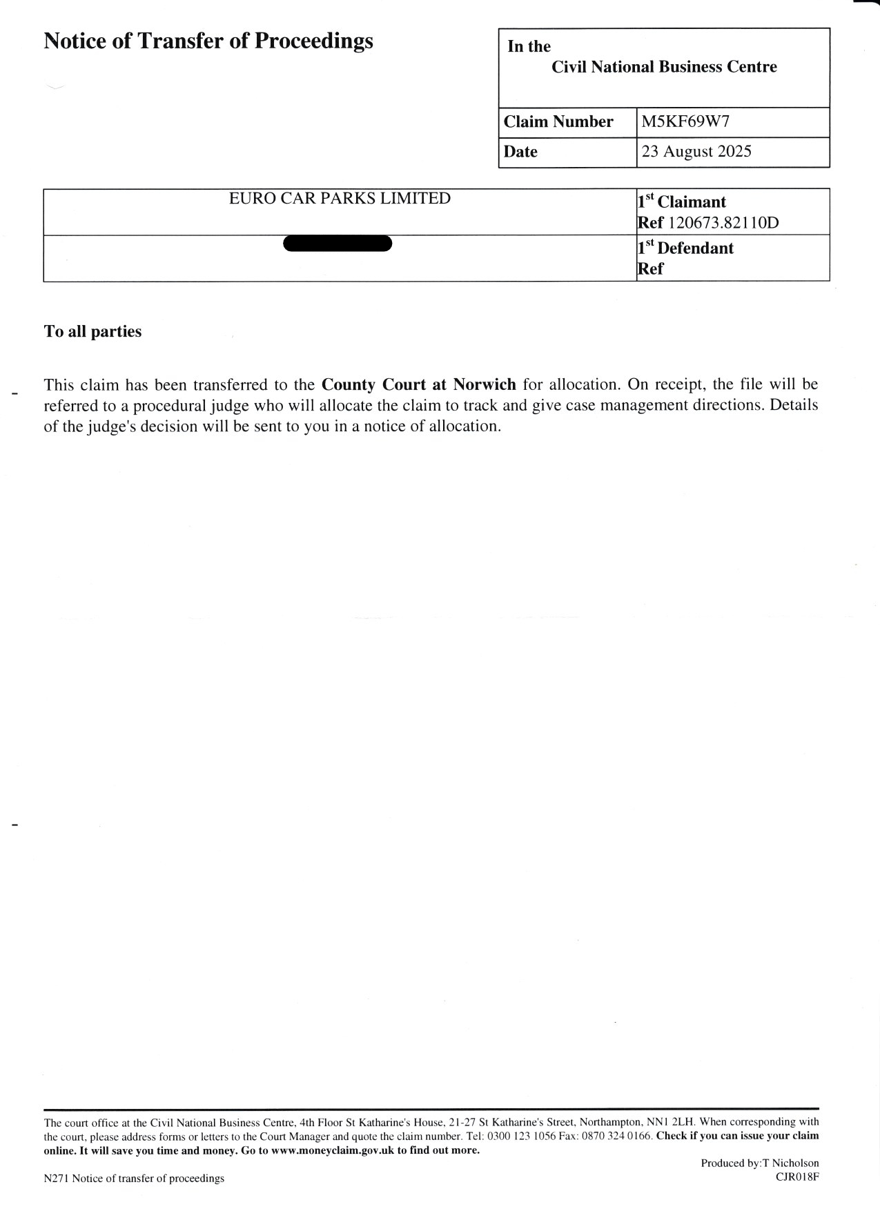 Notice of Transfer of proceedings