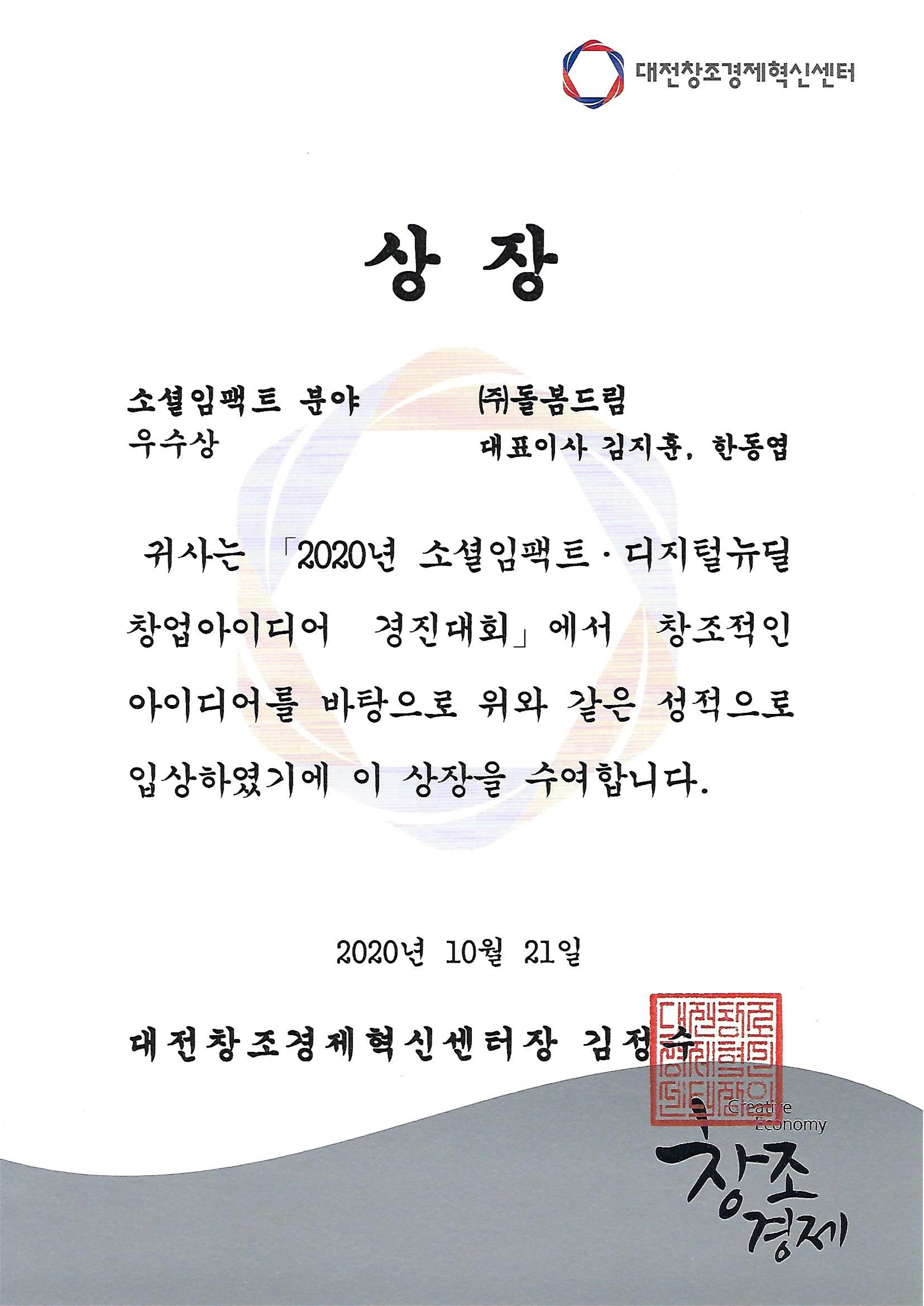 2020 소셜임팩트 디지털뉴딜 창업아이디어 경진대회 상장_1
