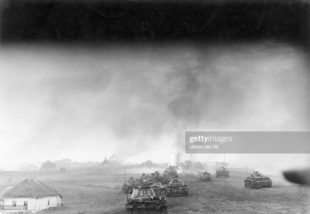 (AG South, 1. armoured army (Kleist) - Ukraine Group of tanks ahead of a burning village in the step