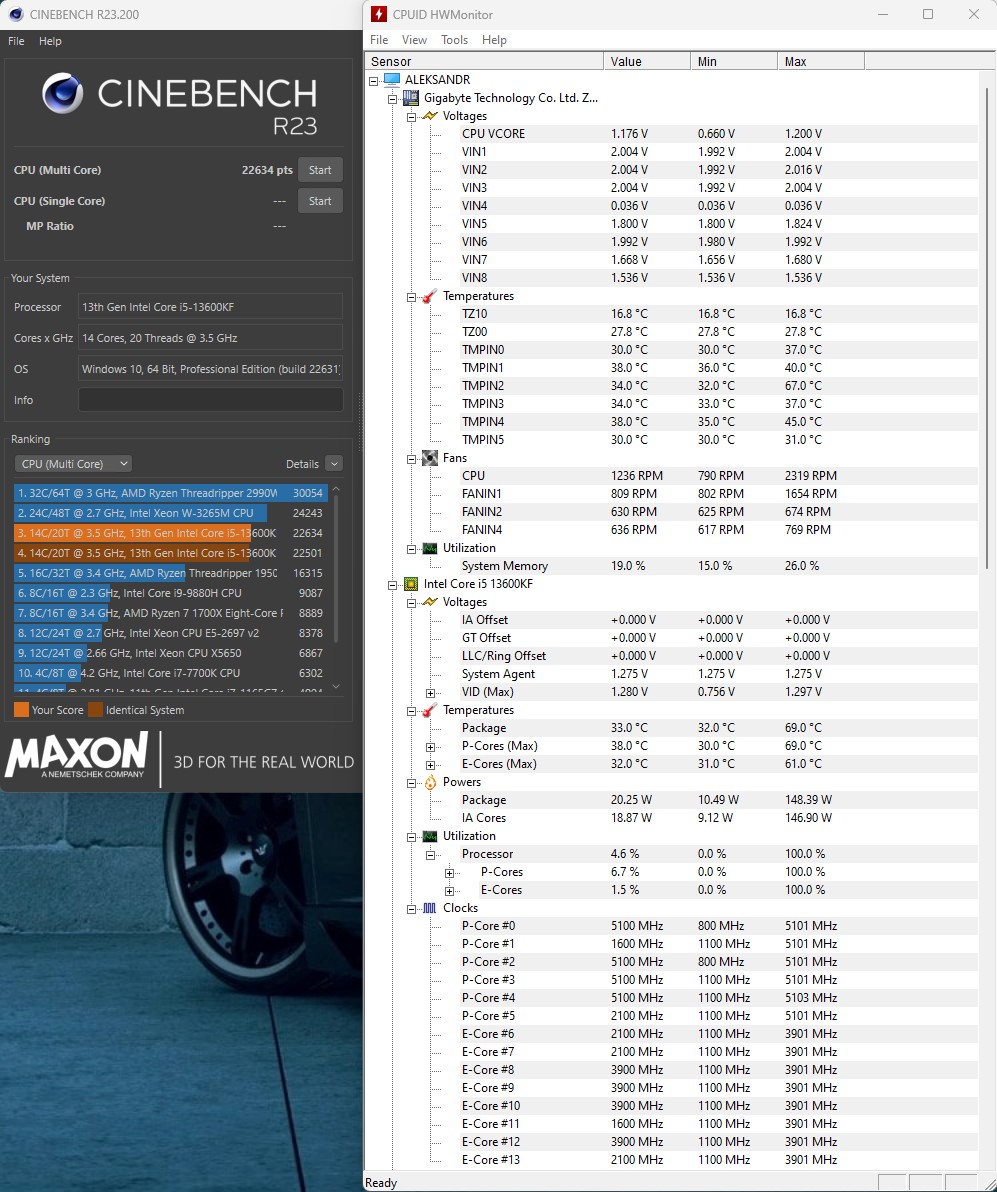Cinebench R23 (13600KF@5.1GHz-3.9GHz) Adaptive 1.2v HWMonitor (результат N2)