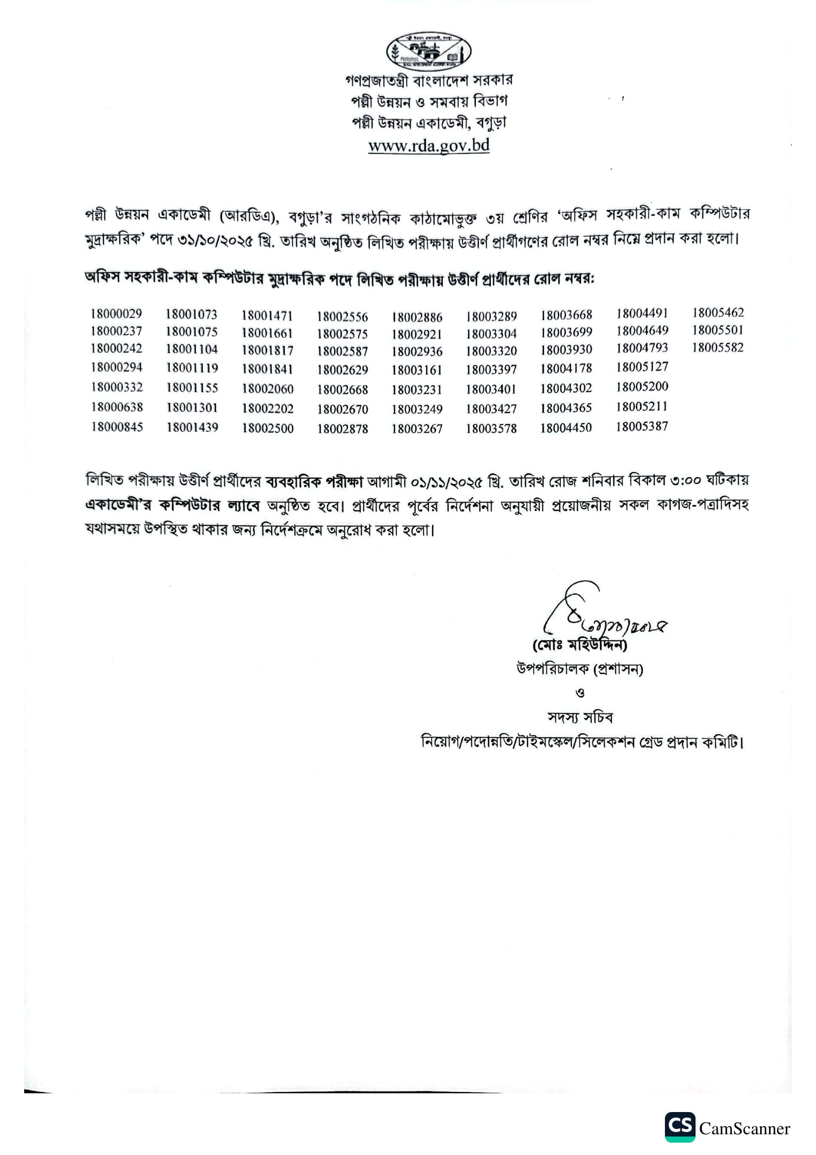 RDA Bogura Office Assistant Cum Computer Typist Exam Result 2025 PDF 1