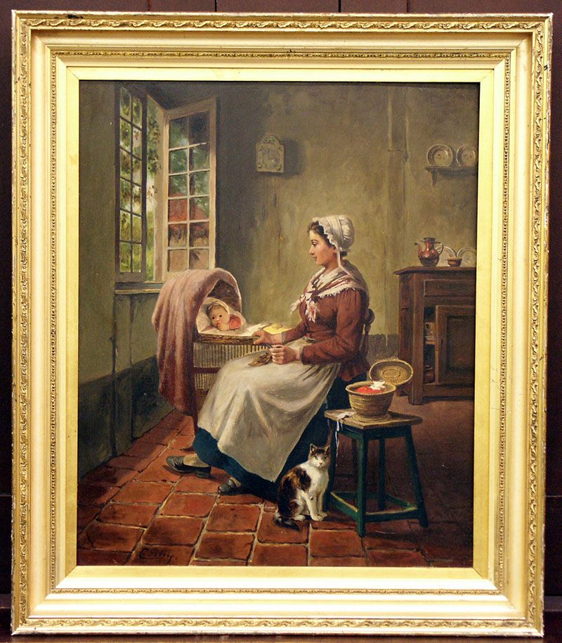 1-ori_-T111-Fine-19th-C-French-Genre-Oil-Painting-On-Wood-Panel-Woman-With-Baby-By-Window-Artist-C-P