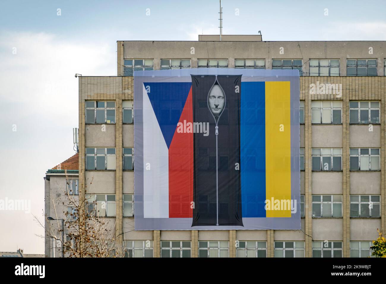 edificio del ministero dell interno ceco con banner il presidente russo vladimir putin in una borsa