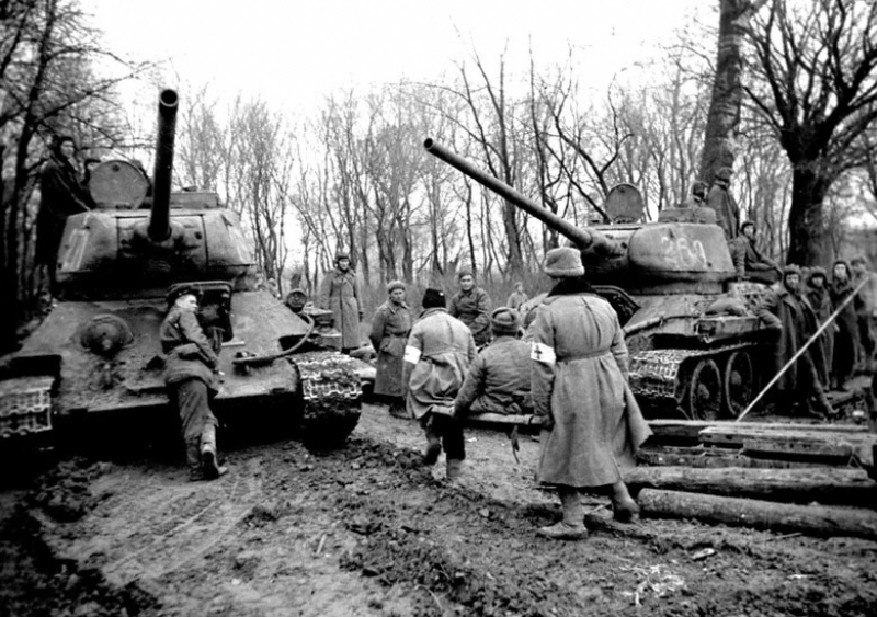 Эвакуация раненых на советских танках на подступах в Будапешту