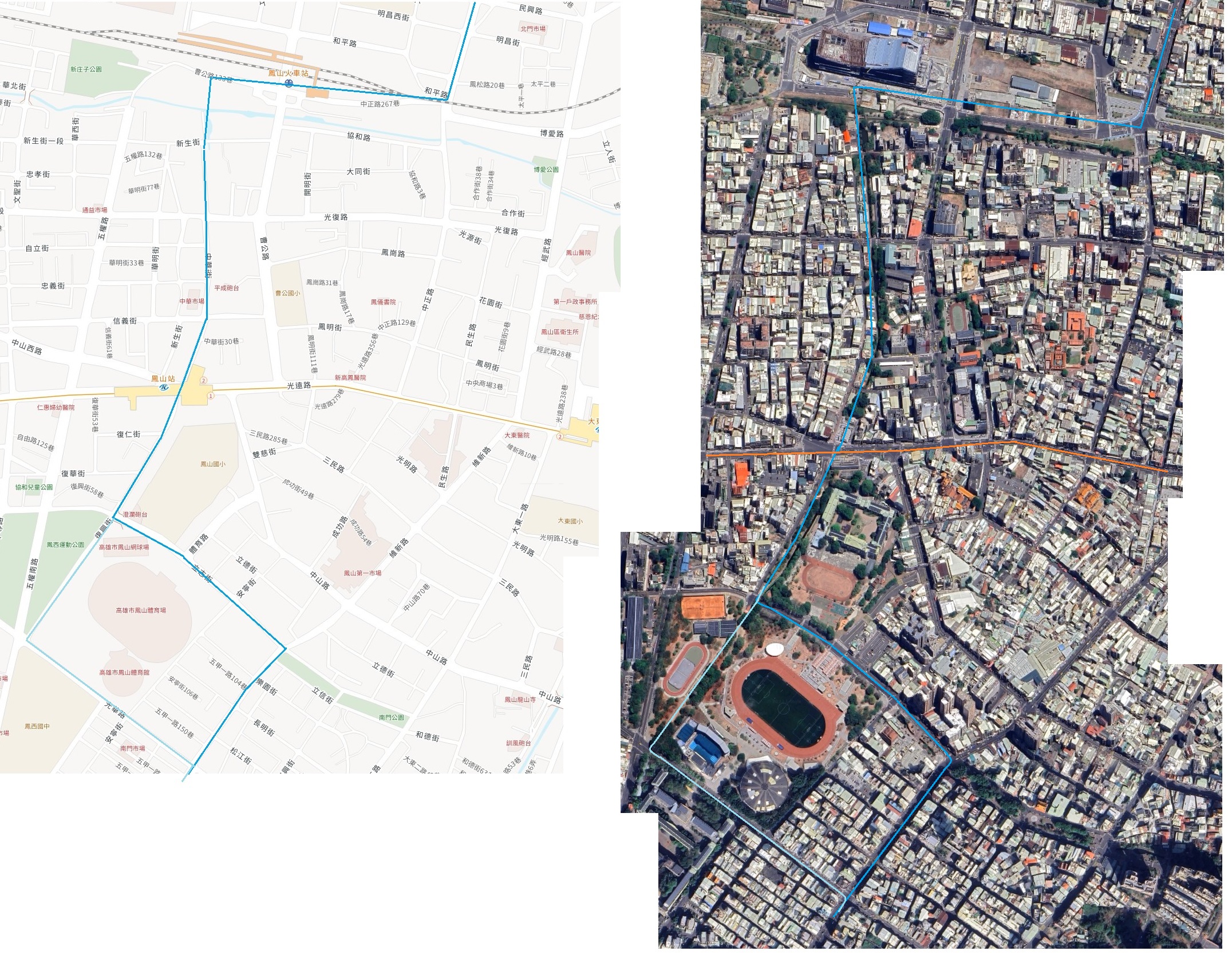 鳳山車站附近街道衛星雙圖