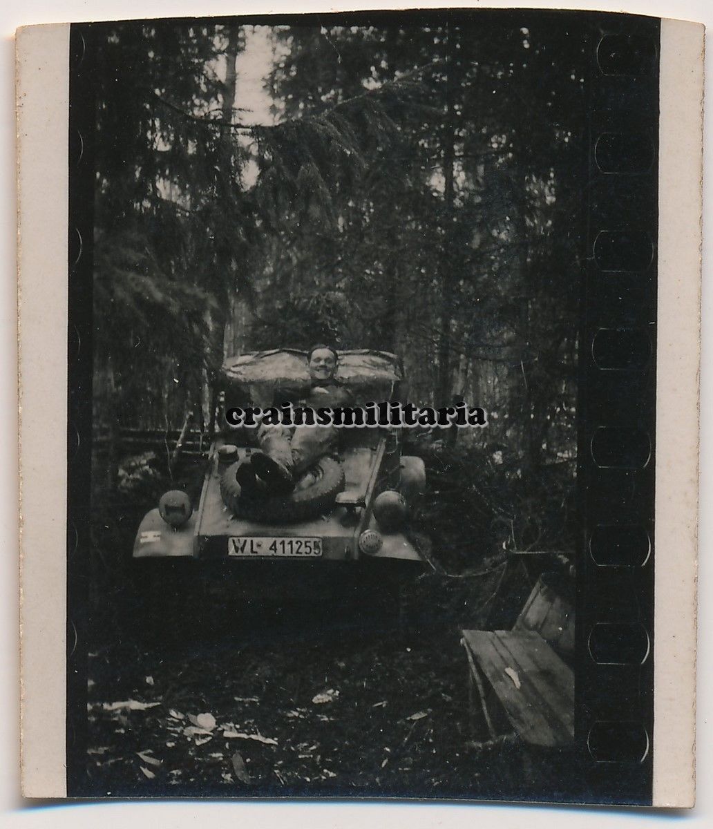 Orig. Foto LWFD Soldat m. Volkswagen Kübelwagen Typ 82 Pkw in Ru